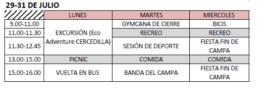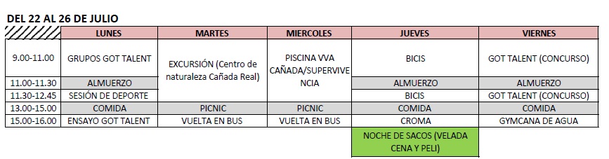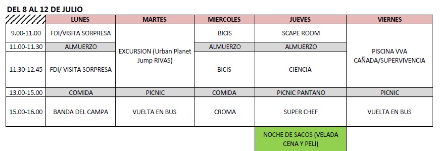 Aquí tenéis todo el planning y la organización del campa, indicado por semanas y días.