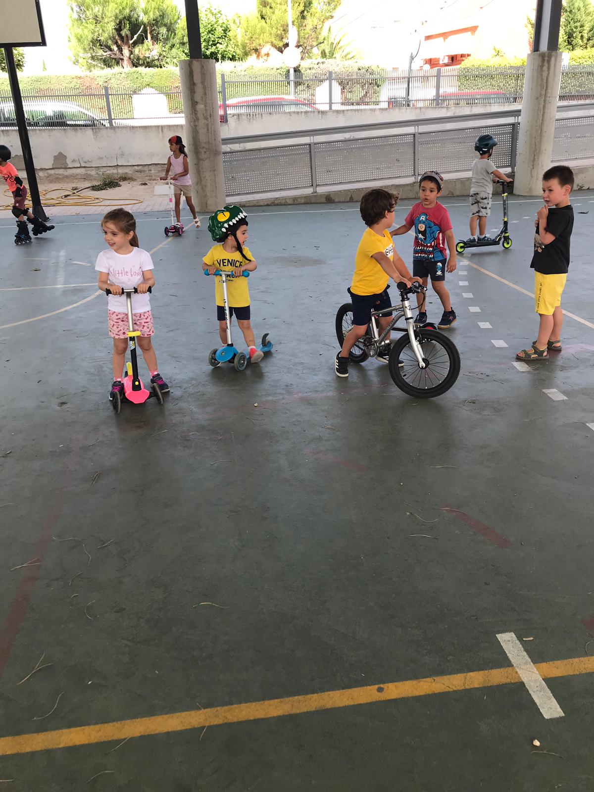 Por la mañana todos los alumnos han estado en el cole jugando, haciendo circuito y dinámicas con sus patines, patinetes y bicis. El grupo de mayores no ha salido por el campo por el intenso calor que ha hecho.