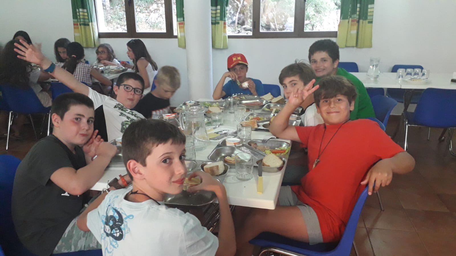 Después han vuelto al albergue, se han duchado y han ido a reponer fuerzas en la cena: Gazpacho, nuggets, patatas, arroz a la cubana, pollo asado , fruta,.. Una gran variedad de comida a su disposición.
