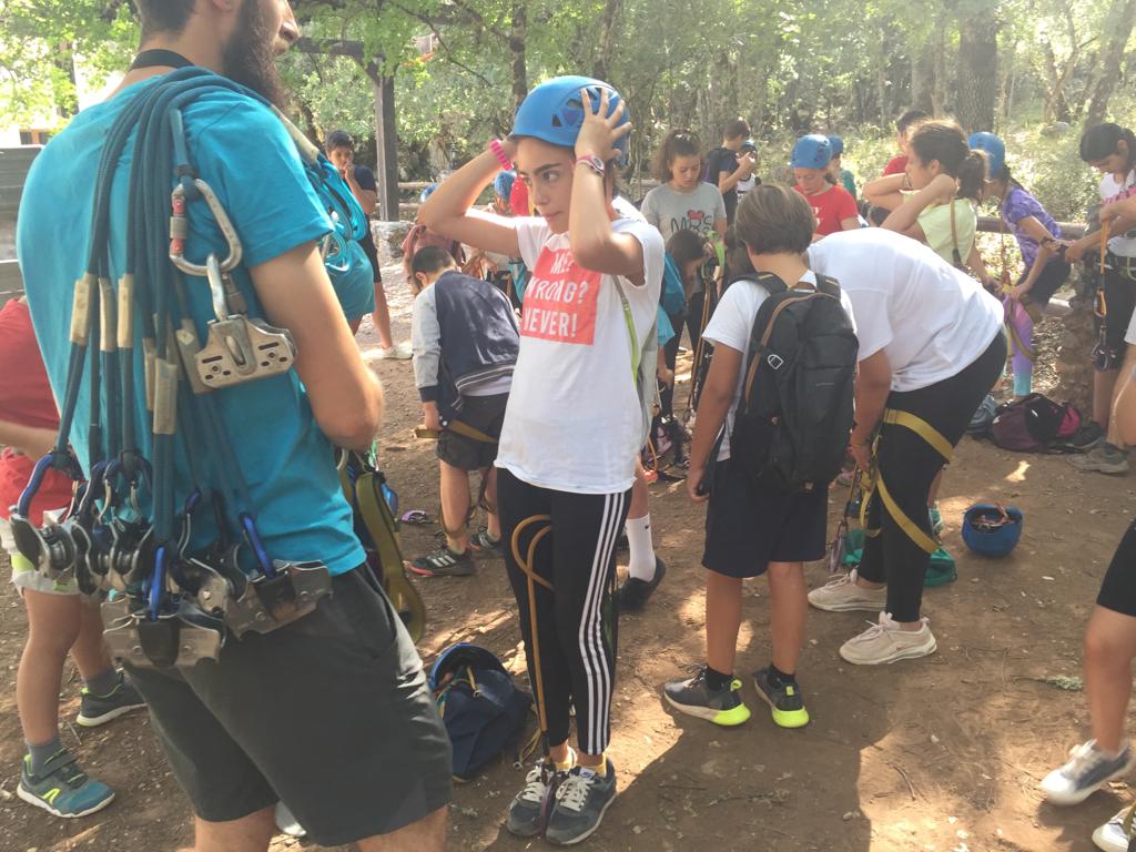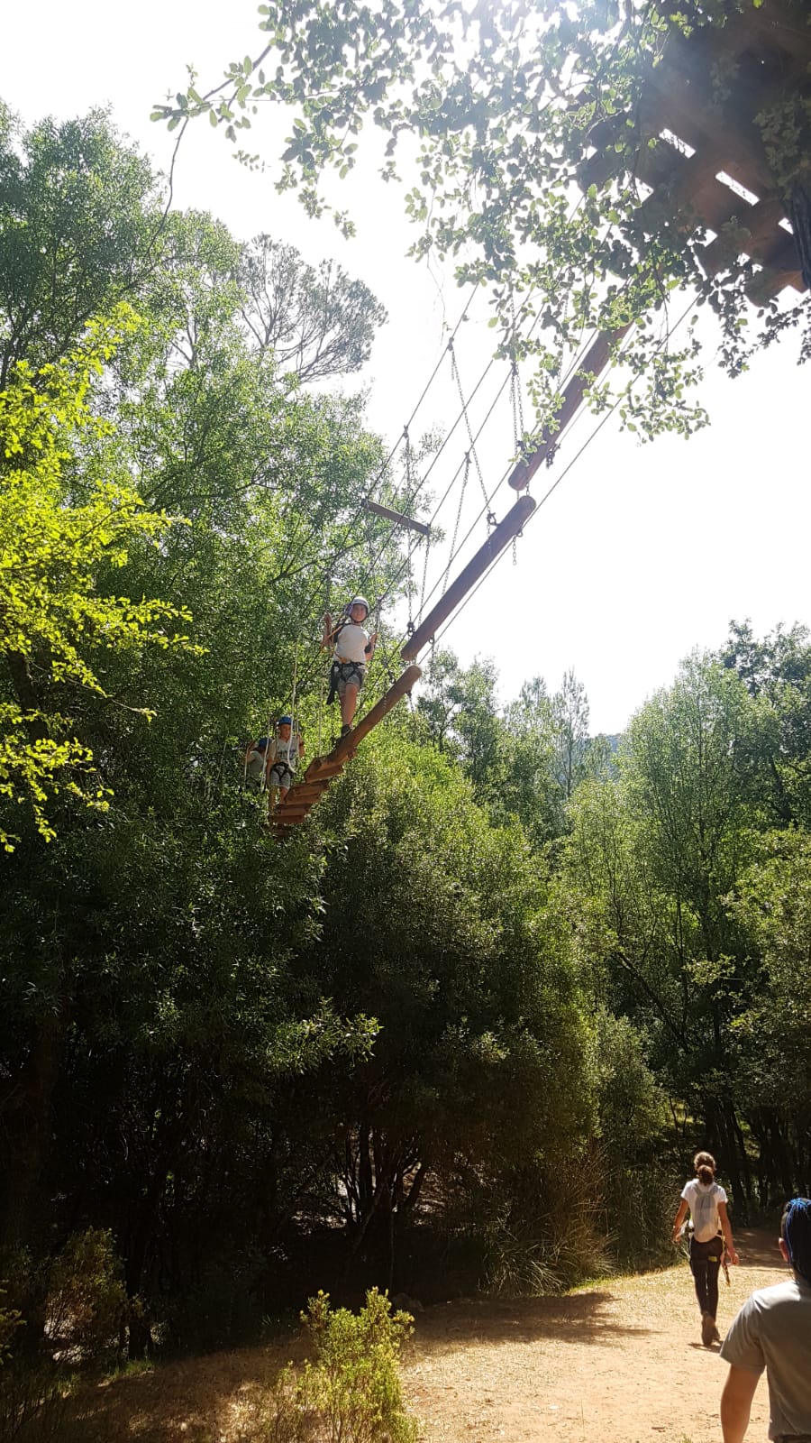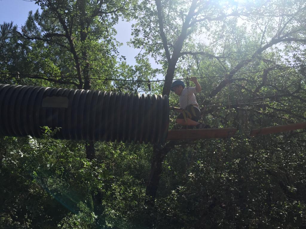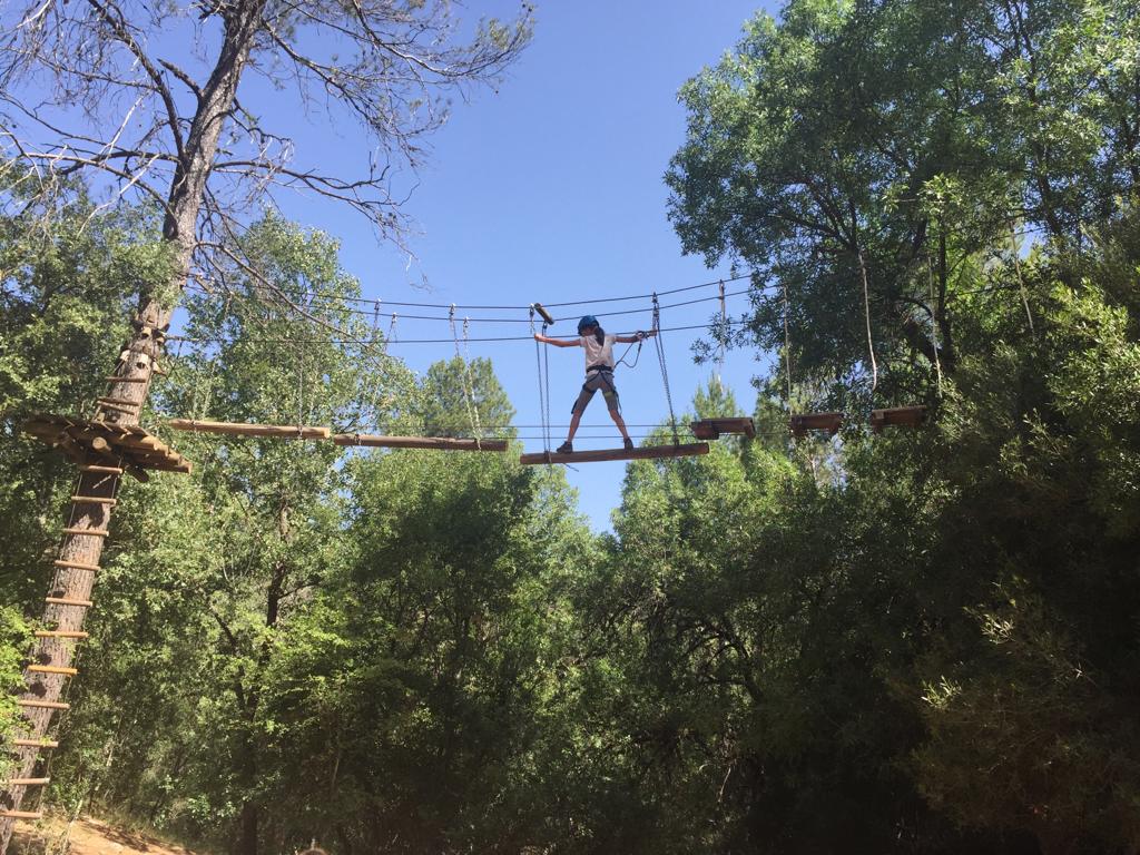 Comenzaron bien pronto con un circuito de puentes arbóreos: puentes suspendidos en en la copa de los árboles. Cada tramo del recorrido tiene su dificultad: puentes tibetanos, pasarelas de troncos, redes y mucho más. Mediante el empleo de elementos de seguridad como arneses, bagas de anclaje con mosquetones y cascos, nuestros alumnos han podido disfrutar de las increíbles vistas y la gran vegetación de la zona.